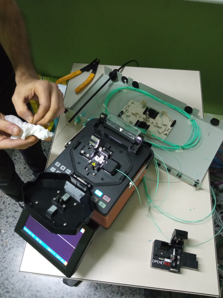 - Tirada de fibra óptica entre plantas, fusionado de la misma y realización de conexiones en bandejas